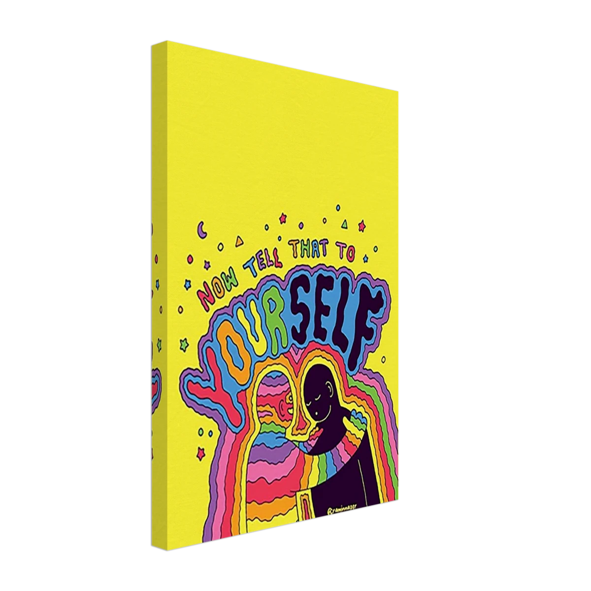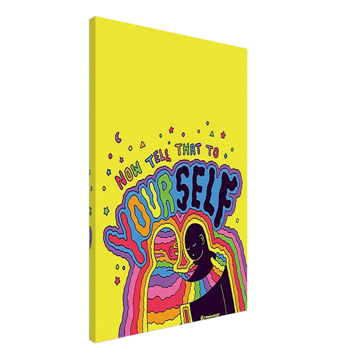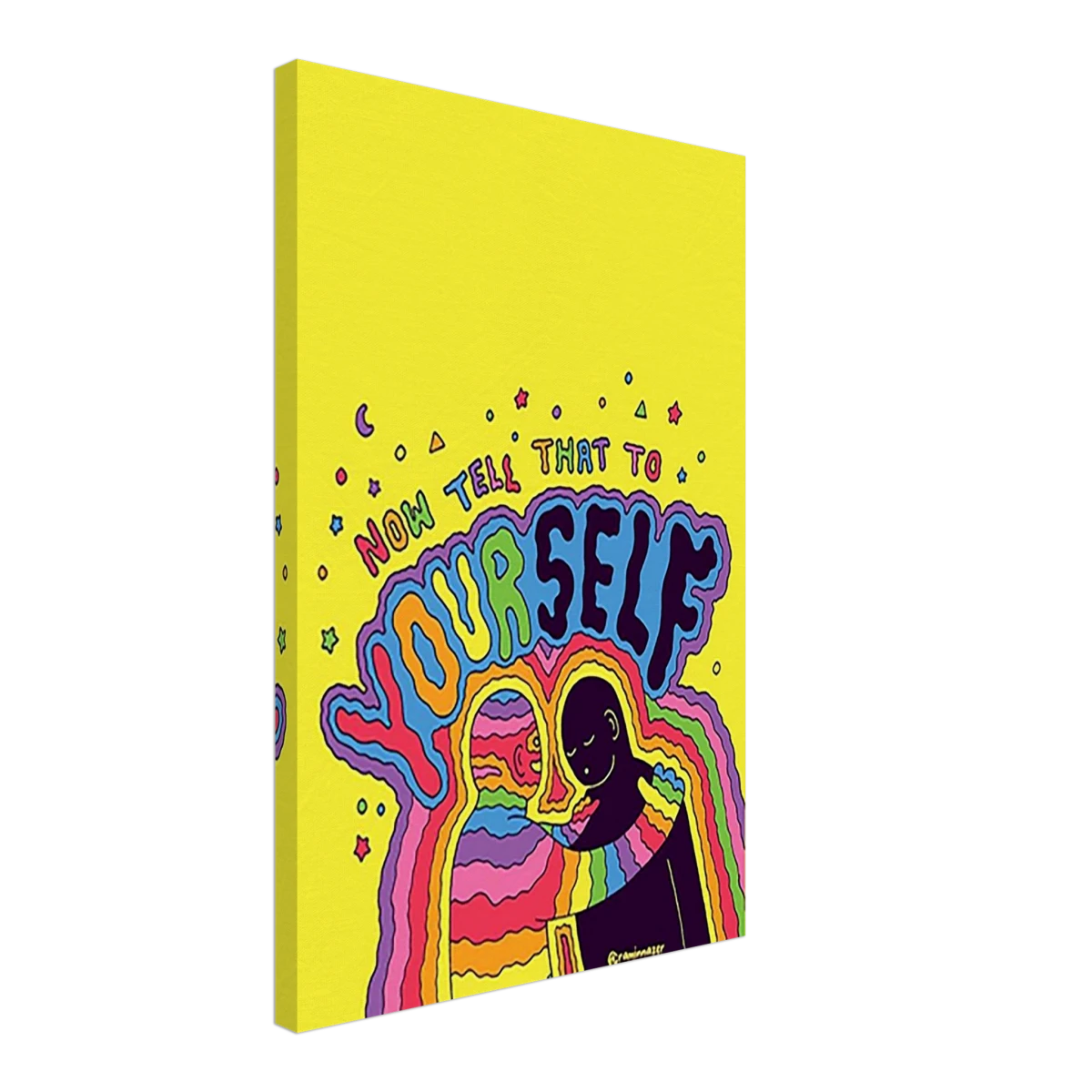 Step into a burst of color and compassion with Now Tell That to Yourself – a striking pop-art-inspired creation that champions self-love and emotional awareness. Set against a radiant yellow backdrop, this piece features a rainbow-cloaked figure embracing its shadow self, surrounded by hypnotic waves of color and the bold reminder: Now tell that to yourself.